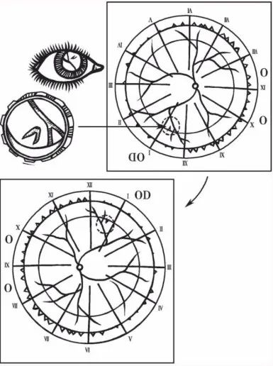 因雙目間接檢眼鏡特殊的光學(xué)原理,經(jīng)過目鏡、物鏡的兩次成像,在檢查者與物鏡之間形成一倒置放大的像。這是學(xué)習(xí)雙目間接檢眼鏡時遇到的最大困難。處理倒像的方法是:①檢查者在心中矯正這個倒像;②按呈現(xiàn)在聚光透鏡上的圖像畫在倒置的眼底圖紙上,檢查結(jié)束時將倒置的圖放正,就可展現(xiàn)實際眼底的立體關(guān)系(圖4)。也就是說檢查周邊部眼底時,準(zhǔn)備檢查某個方位,就讓被檢眼向某個方向注視,轉(zhuǎn)動眼球,檢查者站在其對側(cè),檢眼鏡所見的眼底即為該方向的眼底,簡言之,想看何處,就讓被檢眼向何方向轉(zhuǎn)動,即可看到何處。這種檢查方法初學(xué)者開始不很適應(yīng),如按照檢查方法操作及繪圖,堅持使用,即可較快地掌握。
