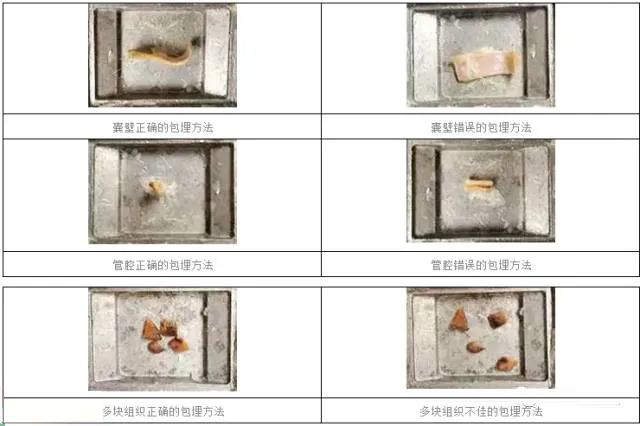 組織的包埋關系到診斷的準確性,如囊壁、管腔組織等組織必須豎直包埋。包埋時如果是成堆組織,一般采用組織的最大面包埋,如果組織是平切的,應該按照醫生取材的要求,把朝下的面作為包埋面。小塊多顆組織,應盡量放在一起,并保證在一個平面上。對于一些需要切出層次的標本如:胃黏膜活檢標本,不能按一般的規律取最大包埋面,應采取窄長的面豎包;如果是U,V字形的,也應該按U,V字的形狀豎包,這樣才能切到組織的全層。