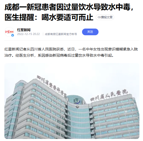 陽”了就要多喝水,這是大家熟知的防治新冠小妙招。然而,喝水也是有講究的,否則可能適得其反,引發(fā)其他問題。近日,一名新冠陽性的女患者就因為喝水過量,導(dǎo)致“水中毒”,被送到四川省人民醫(yī)院進(jìn)行搶救。什么是“水中毒”水中毒(water intoxication),又稱稀釋性低鈉血癥…