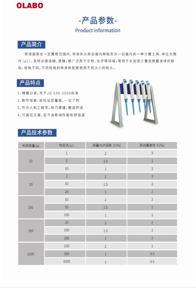 國產OLABO,B系列單道可調式移液器20-200μl量程:20-200μl,精確分液,數字視窗,符合人體工學,握姿舒適